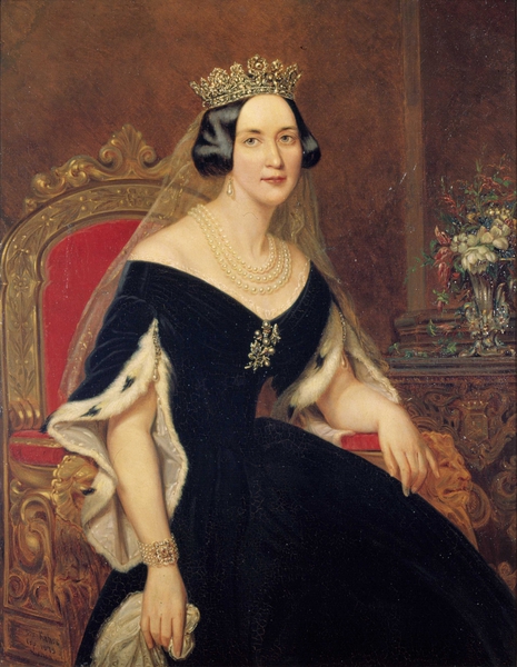 Sittende knebilde, hode 1/4 høyre profil, kropp 1/2 høyre profil. Kroneformet diadem med hvitt kniplingsslør. Hår brunsvart med grått glanslys, skill på midten. Ansikt lyst brunlig med rosa kinner. Øyne grå. I høyre øre stor dråpe-perle. Om halsen 3-radet perlekjede. Kledd i svensk hoffdrakt ca. 1850. Svart, drapert kjole med vid utringning, rundt utringningen kniplingsrysj. Oppsplittet erme kantet med hermelin og foret med grå silke. Øverst i splitten festet gullsmykke med perle. Foran i brystet en brosje med perler, formet som en gren. Trangt korsettliv ned i spiss foran. Vidt, rynket skjørt. Venstre arm hviler på stolens armlene, høyre henger ned og holder hvitt tørkle. Om høyre arm bredt armbånd. Sitter i rikt utskåret stol trukket med rødt. Bakgrunn brungrå, til høyre utskåret bord med blomsteroppsats.