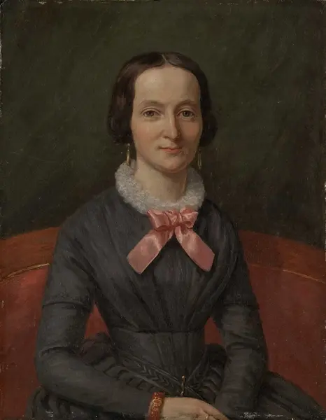 Hoftebilde, sittende, en face. Hår brunt, skilt på midten, glatt langs ansiktet, samlet i nakken. Ansikt svakt rosa med store deler under grå skygger. Øyne grå. Lange, smale gull øredobber. Gråhvit bred rysj i halsen med rosa silkesløyfe foran i halsen. Grå kjole, foldelagt på langs over brystet, stramt i livet, går ned i spiss foran med et mønstret belte nedenfor livlinjen. Gull beltespenne. Folderikt skjørt. Om håndleddet armbånd i rødt og gull. Sitter på rød sofa med gul stripe nedenfor øverste kant. Bakgrunn grågrønn.