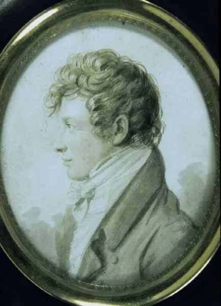 Brystbilde. Hel venstre profil. Hår lysbrunt, bustet. Gråhvit fadermorder og do. halsbind knyttet i sløyfe foran. Lys gråbrun frakk med høy dobbeltkrage. Bakgrunn gråhvit med grå skygger.