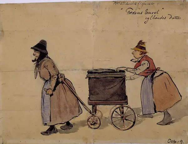 Gikk rundt med positivet "Fredens Engel" i Kristiania. 1) Hel figur, hel venstre profil, foroverbøyd. Gråsvart hatt med svart bånd og sløyfe under haken. Brun kjole. Blårutet forklæ. Svarte strømper. Store, gråsvarte sko. Holder positivets drag i høyre hånd. 2) Hel figur, hel venstre profil, foroverbøyd.Gul hatt med brunt bånd. Rød vest, grå bluse. Blått forklæ, brunt skjørt. Grå sko. Dytter på positivet.