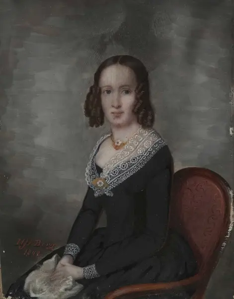 Sittende knebilde. Hode en face, kropp 1/2 venstre profil. Hår brunt, skilt på midten med hengekrøller ned på hver side. Om halsen et kjede med en rød og hvit blomst foran. Rundt utringningen en gråhvit blonde festet med en brosje i brystet. Gråsvart kjole med stor utringning utover skuldrene og over brystet. Korsettliv som ender i en spiss foran. Rik skjørtevidde. Lange, trange ermer med blondemansjetter. I fanget holder hun med begge hender en gråhvit pompadour. Sitter i rød lenestol. Bakgrunn i forskjellige grå sjatteringer med røde islett.