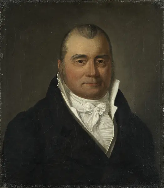 Brystbilde, en face med dreining mot høyre. Hår glatt tilbakestrøket, grått og svart. Ansikt brunrødt, bredt. Øyne brune. Gråhvitt halsbind knyttet i sløyfe og do. plissert kalvekryss. Gråhvit vest med høy enkeltkrage. Gråsvart frakk med svarte skygger og høy dobbeltkrage. Bakgrunn grå.