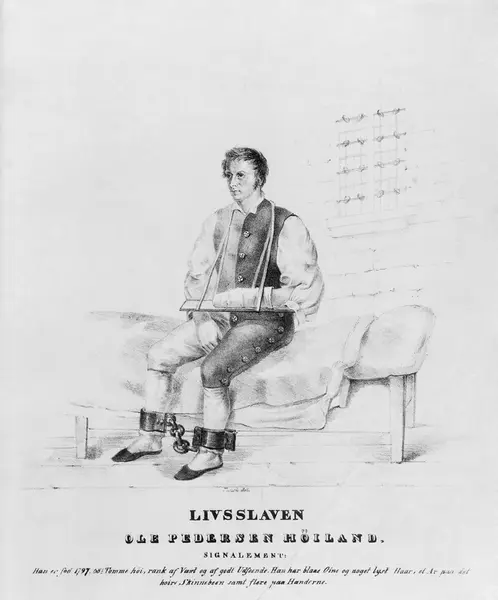 Påtegnet under billedfl.: Livsslaven/ Ole Pedersen Høiland./ Signalement: / Han er fød 1797, 68 1/2 Tomme høi, rank af Væxt og af god udseende. Han har blaae øine og noget lyst Haar, et Ar paa det/høire Skinnebeen samt flere paa Henderne - J.nr. 162 i O.B's katalog av 1909.