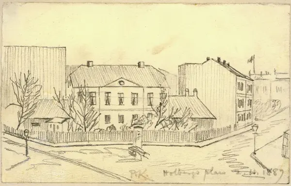 Løkken ble nedrevet i 1890./ Vosgraffs løkke/ Originalen til denne skitse er tegnet på et blad i en/ gammel skitsebok, d.2.nov. 1887, da jeg i mine/ studenterdager bodde vis a vis løkken. Den åttes dengang/ av Cand.mag Søraas, til hvis hustru jeg 12 år senere/ gav billedet. Det eies nu av frk Ingeborg Søraas. / Kopien er nøiagtig og utført av mig febr. 1923 / Pål Kars - Regnskapsnr 13/1923
