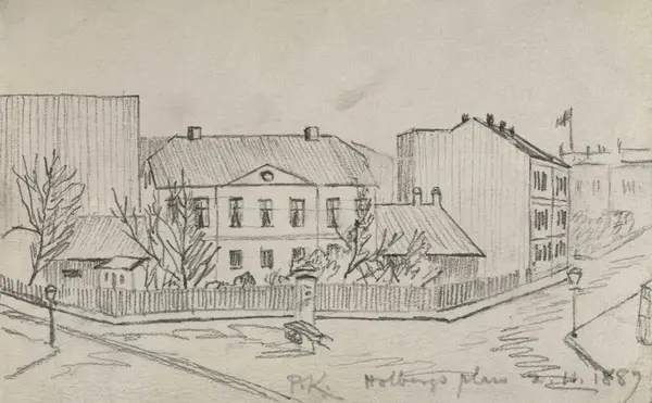 Løkken ble nedrevet i 1890./ Vosgraffs løkke/ Originalen til denne skitse er tegnet på et blad i en/ gammel skitsebok, d.2.nov. 1887, da jeg i mine/ studenterdager bodde vis a vis løkken. Den åttes dengang/ av Cand.mag Søraas, til hvis hustru jeg 12 år senere/ gav billedet. Det eies nu av frk Ingeborg Søraas. / Kopien er nøiagtig og utført av mig febr. 1923 / Pål Kars - Regnskapsnr 13/1923