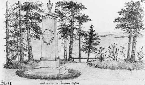 Monument over Christian August på Bygdøy tekst på sokkelen (skrevet på baskiden av tegning): "Dette Minde sattes / af / Prinds Friderich til Hessen / Aar MDCCCX/ og fornyedes Aar MDCCCXXV/ af Christian Frederik / Norges Konge."