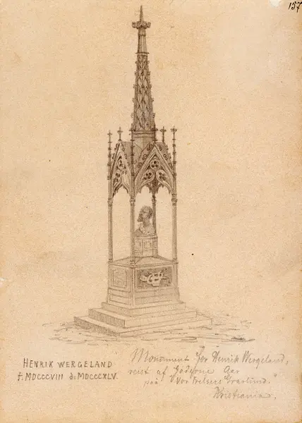 Henrik Wergeland/ f: MDCCCVIII d: MDCCCXLV/Monument for Henrik Wergeland, reist af Jøderne Aar/paa "Vor Frelsers Gravlund"/Kristiania.