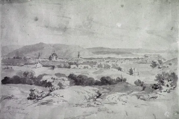 I forgrunnen åpent, småkupert terreng. Midt på bildet ligger Schramløkken (hjørnet av Josefinegt- Pilestredet). Til høyre sees baksiden av Slottet, til venstre ligger Trefoldighetskirken og St. Olavs kirke. I bakgrunnen Ekebergåsen og fjorden.