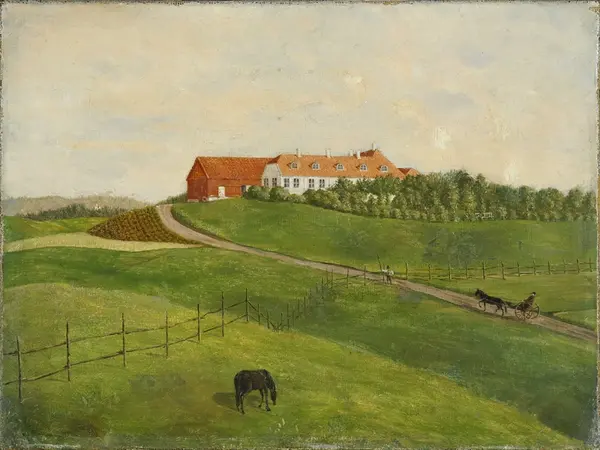 Sett fra nord. På en lav høyde til h. ligger lav gråhvit bygning med rød låve bakenfor. Opp til gården fører en vei. På denne kjører en karjol, der den daværende eier Lars Steensgaard sitter. Midt på veien er en grind, som åpnes av en mann.