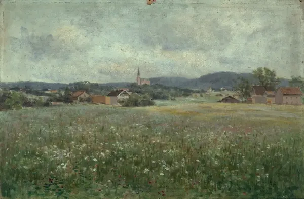Sett mot Vestre Aker kirke, som ligger på høyde i bakgrunnen. I forgrunnen frodig blomstereng. Husklyngen til h. er Majorstuen.