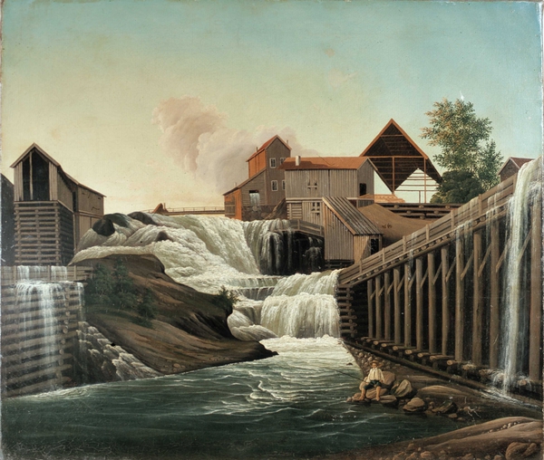 I forgrunnen under fossen sitter en gutt på en stein og fisker. Til h. en demning av tre. På toppen av fossen små, gule trehus med Beierbrua til v.