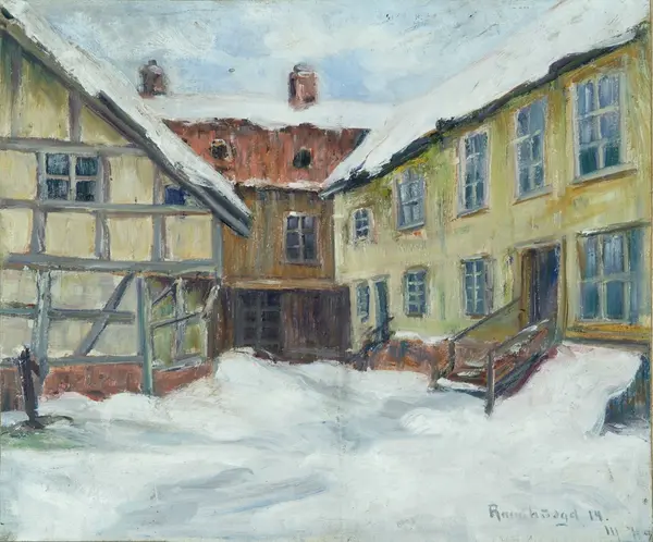 Vinterbilde. Gårdsinteriør. Helt til v. en brun vannpost. Bakenfor denne et bindingsverkshus med utoverhengende 2nen etasje. Til h. en gulgrønn fløy.