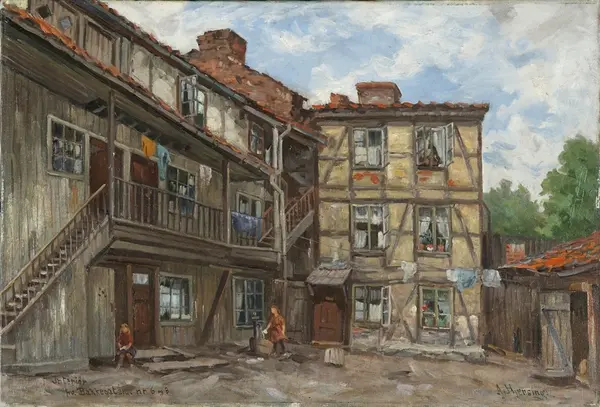 Gårdsinteriør. Huset til v. har utvendig trapp opp til 2nen og 3dje etasje. På tram til v. sitter rødkledd pike; bortenfor står en annen rødkledd pike ved en vannpost.