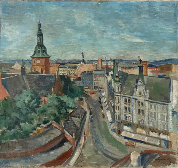 Sette fra taket på hjørnegården til Storgata. Rett fram svingen opp til Stortorget. Til h. Doblouggården. Til v. basarene og Vår Frelsers kirke (Domkirken) med grøt spir. Gata malt Grønlia med blå trikkeskinner og blå trikk. På hjørnet av Torget. en rød varebil. Bakover sees hustak i forskjellige farger med blå åser i bakgrunnen.