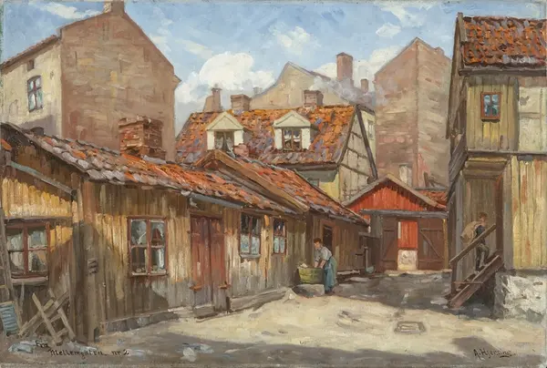 Gårdsinteriør. Foran 2 lave brune hus til v. står en kone og vasker tøy. Til h. går en gutt med sekk på ryggen opp en trapp. I bakgrunnen sees husrekken på den andre siden av gata.