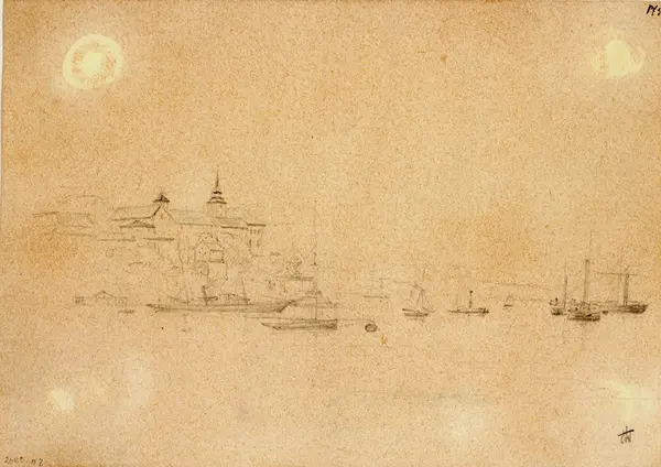 Til v. Akershus festning. Nedenfor havnen med mange båter.