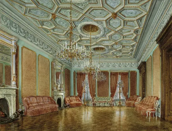 Interiør, ballsal, gobeliner, utsmykninger, dekorasjon, møbler, ildsted, vinduer, gardiner