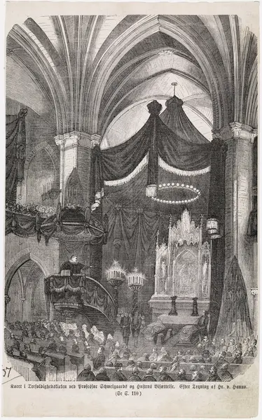 Koret i Trefoldighedskirken ved Professor Schweigaards og Hustrus Bisættelse. Efter Tegning af Hr. v. Hanno