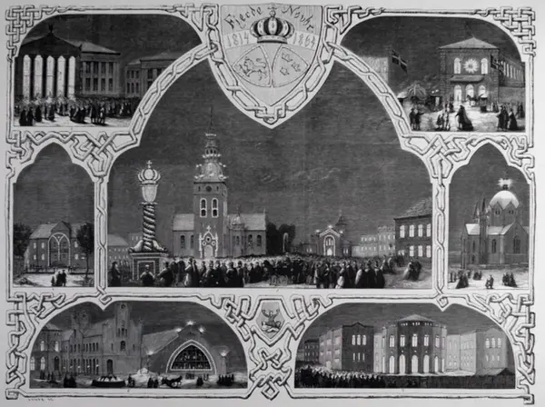 Påskrift under billedfl: 1. Torvet med Omgivelser/ 2. Universitetshallen / 3. Logebygningen (Byens Festivitetslokale) / 4. Latinskolen / 5. Trefoldighetskirken / 6. Jernbanegaarden / 7. Den nye Storthingsbygning
