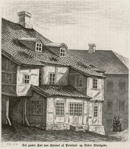 Trykt under motivet: Det gamle Hus paa Hjørnet af Prinsens= og Nedre Slotsgade.