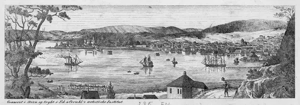 utsikt, fjord, bukt, by, seilskip Domkirken (Vår Frelsers Kirke) er avbildet før ombygningen i 1850.