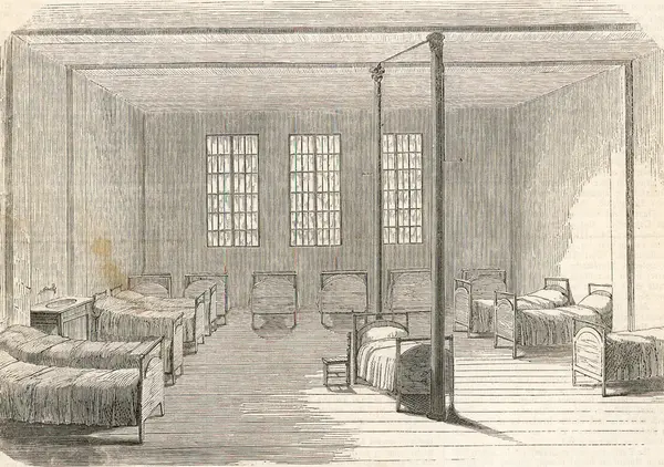 En Sovesal; Christiania Sindsyge=Asyl. (Efter Tegning af Reinh. Boll)