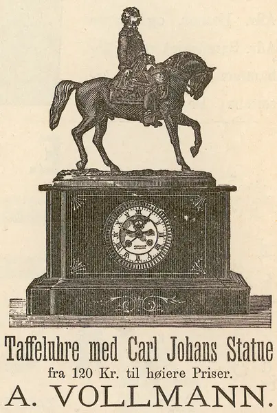 Taffeluhre med Carl Johans Statue / fra 120 Kr. til høiere Priser / A. VOLLMANN.