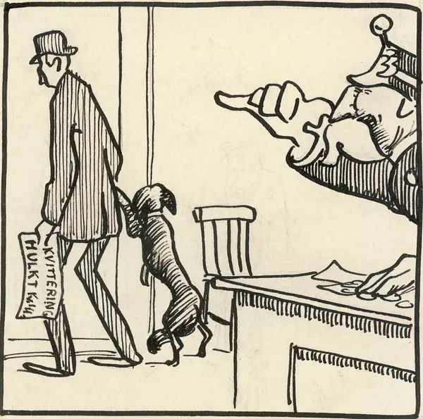Vangen går ut av døren med hund - og en dommer (?) peker nese etter ham.