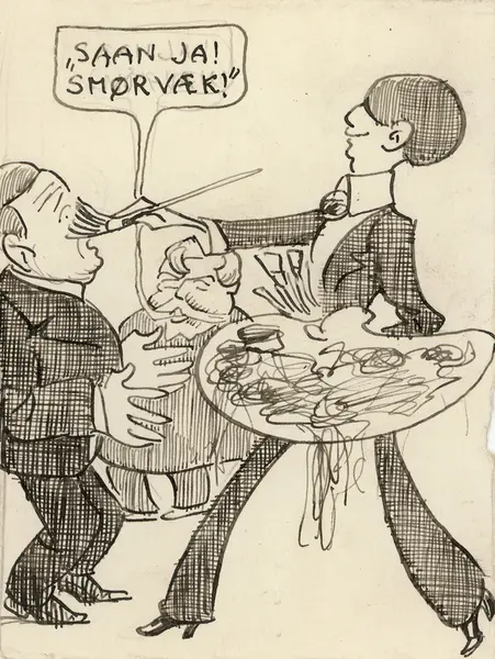 Krohg står med paletten i hånden og smører en mann i ansiktet oppfordret av Jens Wang i bakgrunnen.
