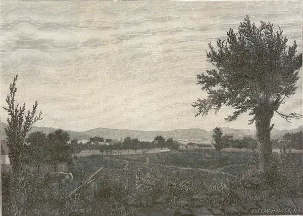 I forgrunnen åpne jorder med to kuer til venstre og et tre til høyre. Jordet strekker seg ned til Stortingsgaten dengang Drammensveien. Det tilhørte Assesor Brochmanns eiendom i Rosenkrantzgaten.
