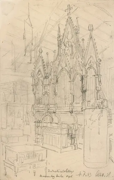 Midt på gulvet står et stort orgel tilhørende Uranienborg kirke.