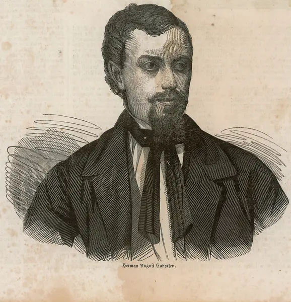 Brystbilde, kroppen en face, hodet 1/2 profil. Kort hår, mustasje og langt fippskjegg. Stor rund panne, store øyne, fyldig munn. Kledd i tidens drakt med slips knyttet i sløyfe med lange ender.