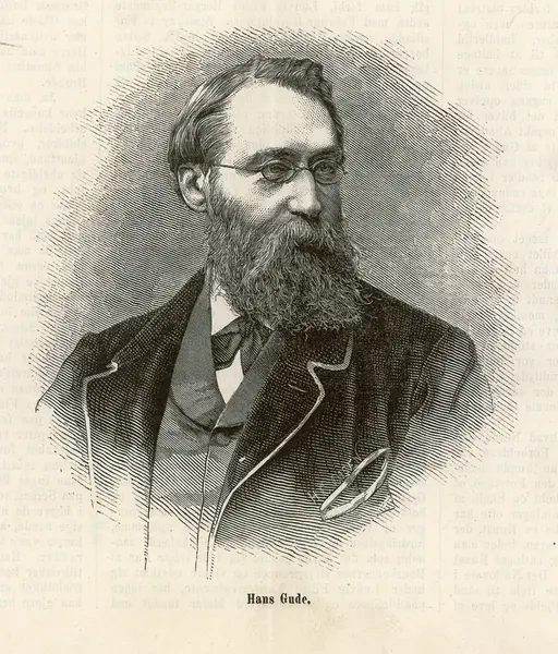 Brystbilde, kroppen en face med dreining til høyre, hodet 1/2 høyre profil. kort, glatt hår skilt på venstre side. Fullskjegg. briller med smal innfatning. Langt, smalt ansikt. Kledd i en jakke kantet med lysere bånd.