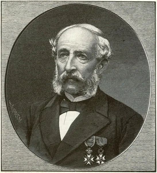 Brystbilde, 1/4 venstre profil. kort hår med krøller ved ørene, skilt på høyre side. Kinnskjegg og mustasje. Kledd i tidens drakt med to ordner på brystet. Portrettet er tegnet inn i en oval, som er satt inn i en firkant.