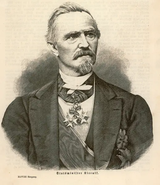 Brystbilde, kroppen en face, hodet 1/4 venstre profil. Bakoverstrøket hår, fippskjegg og mustasje. Høy panne, store øyne. Kledd i selskapsdrakt med ordensbånd på skrå over brystet, to ordner hengende om halsen og to krasjener på brystet til høyre.