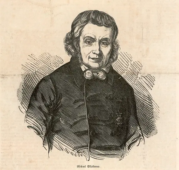 Hoftebilde, 1/8 høyre profil. Langt, svakt krøllet hår med pannelugg, kinnskjegg. Iført halstørkle knyttet i sløyfe, frakk med Nord-stjerneordenen på brystet.