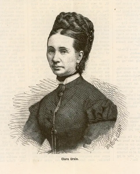 Hoftebilde, 1/2 venstre profil. Håret er flett i en høy runding midt på hodet, skilt på midten. Kledd i tidens drakt.