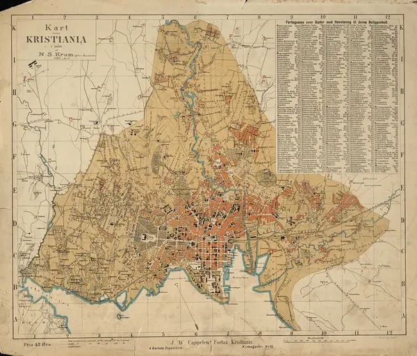 Kart over Kristiania og noe omegn med målestokk 1:15000, med bygrense, gater, hus, bekker, elver og gateoversikt i egen ramme.