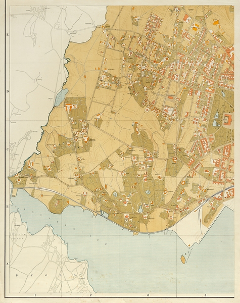 Solbakken til Bislett, Bygdø NØ til Filipstad. Landflaten i Aker hvit, Landflaten i byområdet gulbrun, murbebyggelse rød, trebebyggelse gul, parker / hager grønne, vannflate blå.