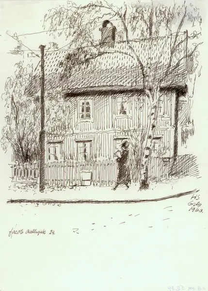 arkitektur, trehus, fortau, kvinne, trær, lyktestolper, gjerde