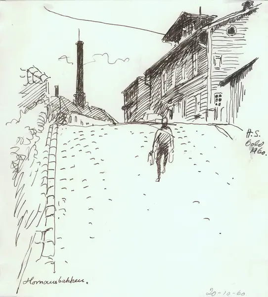 bakke, gateløp, ark, fabrikkpipe, brostein, menneske,