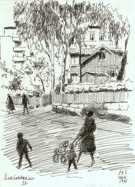 villa, mor og barn, barnevogn, bebyggelse, trehus, trær