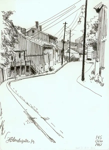 gateløp, husrekke, trehus, lyktestolpe, bebyggelse, fortau, trær