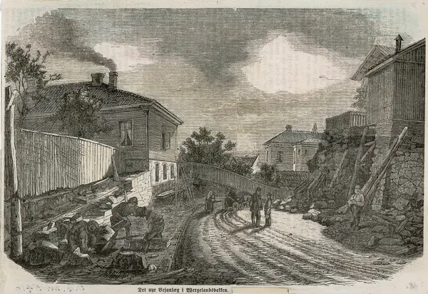 gate, veiarbeide, arbeidere, bygninger, bylandskap
