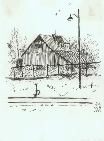 arkitektur, arklåve, uthus, trebygning, gjerde, jernbaneskinner, lyktestolpe, vannpost(?)