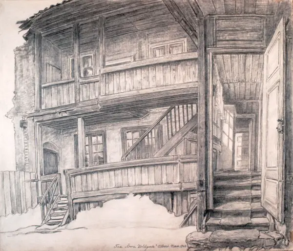 gårdsinteriør, arkitektur, svalgang, trehus, trapp, inngangsparti