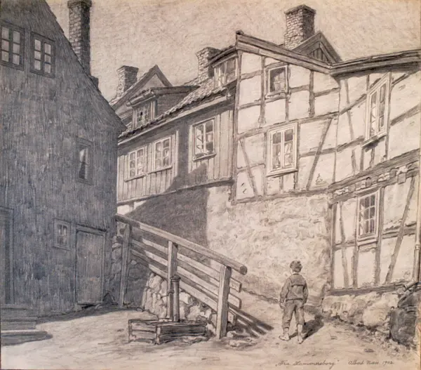 arkitektur, bindingsverk, gatestump, gutt, steinmur, gelender, bro/overgang, pipe
