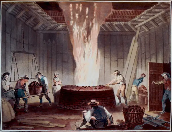 jernverk, smeltehytte, arbeide, arbeidere, ild, varme, kurv, verktøy, vekt