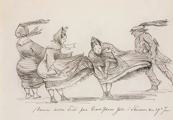 Damer under Seil paa Carl-Johan i Stormen 27de Jan.