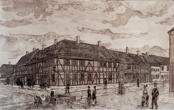 arkitektur, gatekryss, hjørnegård, bindingsverk, brønn, folkeliv